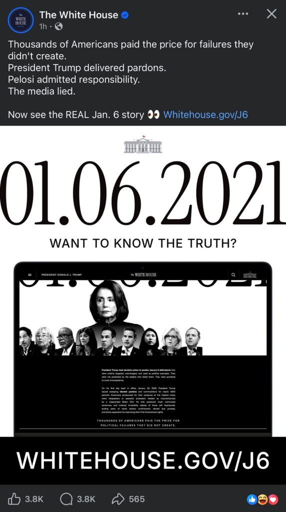 The President’s biggest and most famous lie, is of course the result of the 2020 election. Five years later he still hasn’t been held accountable for his deception, his indecency, and the violence they created. On the fifth anniversary of January 6th, I was flabbergasted to see the following posted by the official White House account: